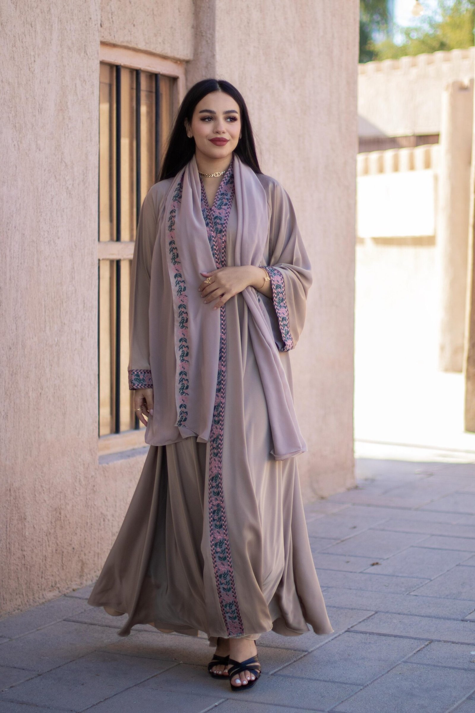 قماش ندى حريري مع شيلة مطروزه و قصة كلوش